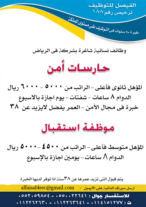 وظائف حارسات امن واستقبال للسعوديات بشركة فى الرياض
